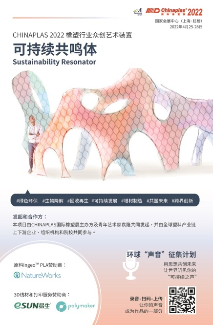 項(xiàng)目由“CHINAPLAS國(guó)際橡塑展”主辦方和青年藝術(shù)家袁隆共同發(fā)起,全球產(chǎn)業(yè)鏈上下游企業(yè)、組織機(jī)構(gòu)和院校共同參與?;顒?dòng)旨在傳遞出“綠色環(huán)保、回收再生、共塑未來(lái)、增材制造、跨界創(chuàng)新、生物降解、可持續(xù)發(fā)展”的關(guān)鍵信息,推動(dòng)全行業(yè)、全社會(huì)、全人類共同關(guān)注塑料回收科技,關(guān)注環(huán)保和可持續(xù)發(fā)展。立即按這里或掃描圖片中的二維碼,向世界發(fā)出你的“可持續(xù)之聲”。