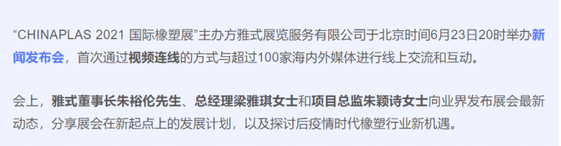 ▲“CHINAPLAS國際橡塑展”首次舉辦線上直播新聞發(fā)布會,超過100家中外媒體出席,與展會主辦方即時在線進行線上交流和互動。