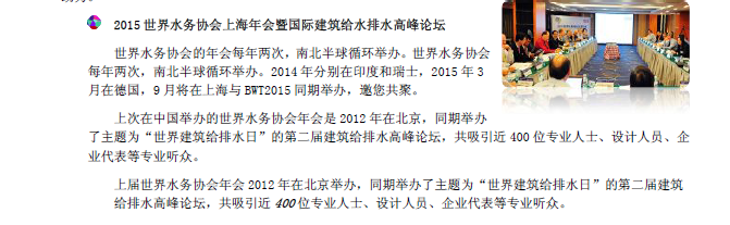 一系列會議及論壇,匯聚行業(yè)高端人士。2015 年更有國際高端會議齊聚申城,為BWT2015 中國建筑水展的成長
